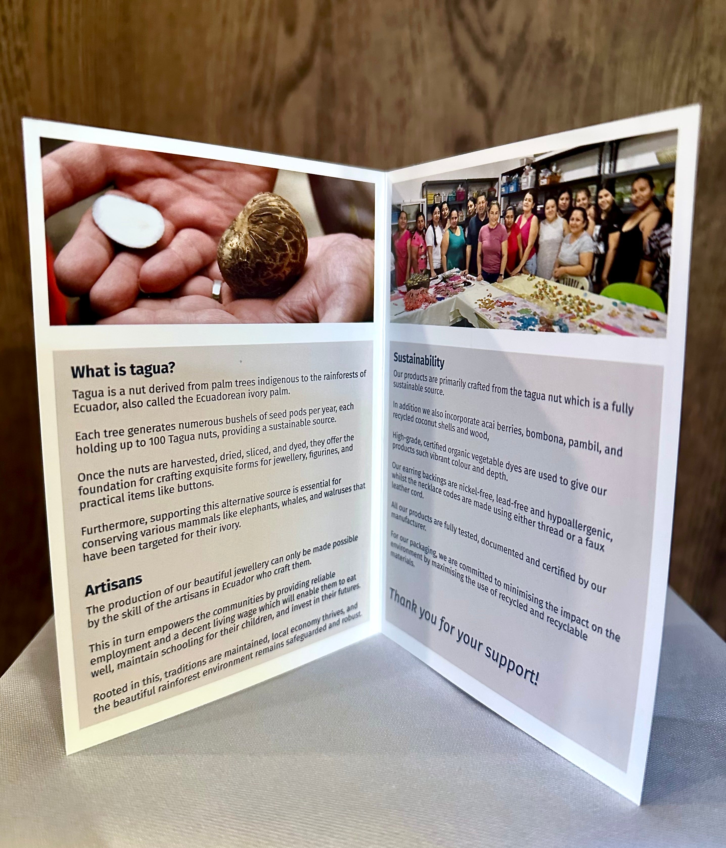 Our beautiful story booklet below is included free with all purchases. In vibrant colours, these inserts provide an insight into the amazing story of how our jewellery is made.